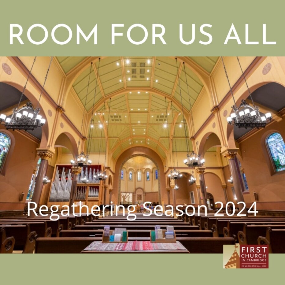 Join us as we begin our Regathering season with Morning Worship at 11:00 a.m., followed by an all-church luncheon at 12:30 p.m. A beloved First Church hymn reminds us that “the household of God has room for us all” as we make our way through a time of transition with the leadership of Interim Senior Minister MIke Solberg. On this journey that we walk together, there is room for your grief and your joy, your longings and your celebrations, your anxieties and your anticipation. Bring all that you are to this place where God assures us that there is room for it all, and for us all!